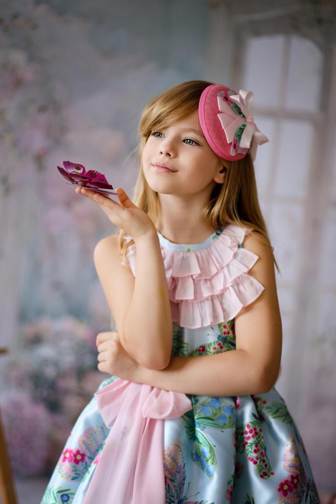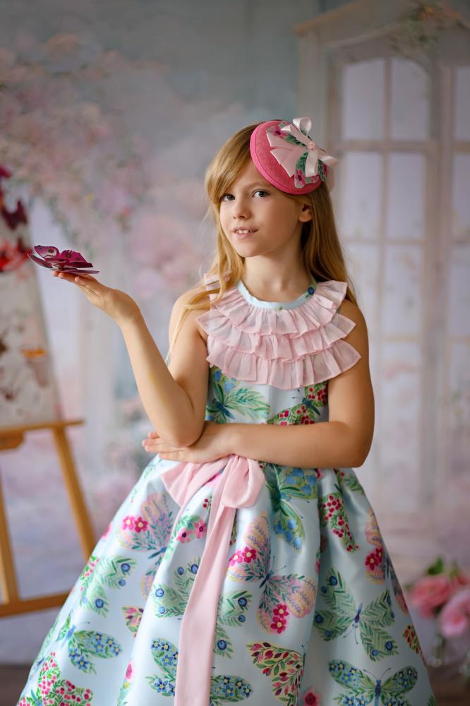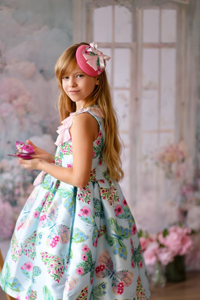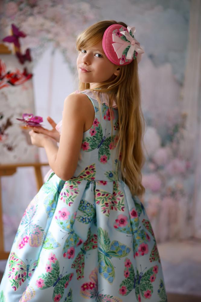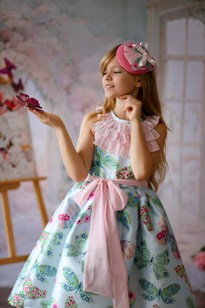 مجموعة بترفلاي لهذا الموسم المليئة بالبهجة ، قطعة غنية بالألوان والتفاصيل التي تملأ مناسبتكم بهجة وجمالا . مصنوع من التفتة الفرنسية بطبعات فراشات ملونة ، بتصميم كشكشة على الصدر من الشيفون الناعم وحزام يربط من الأمام أو الخلف .